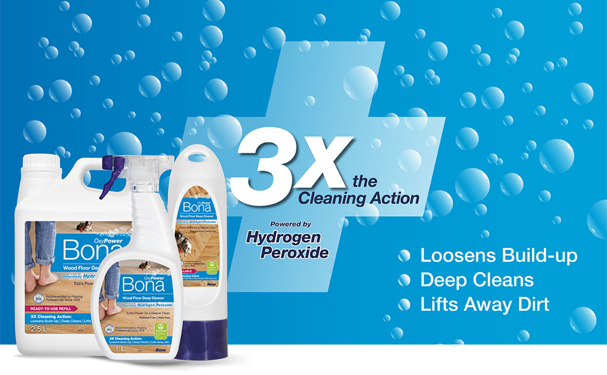 Bona’s OxyPower Deep Cleaner is powered by active ingredient Hydrogen Peroxide. This naturally occurring disinfectant delivers a cleaning power 3 times that of normal cleaners. This makes OxyPower Bona’s most powerful cleaner. It dives deep, removing heavy build-up and stubborn dirt without the need for scrubbing. With an oxygenated formula powered by hydrogen peroxide, OxyPower foaming action attacks organic stains, odour-causing molecules and bacteria – like bleach but without the fumes or abrasiveness.